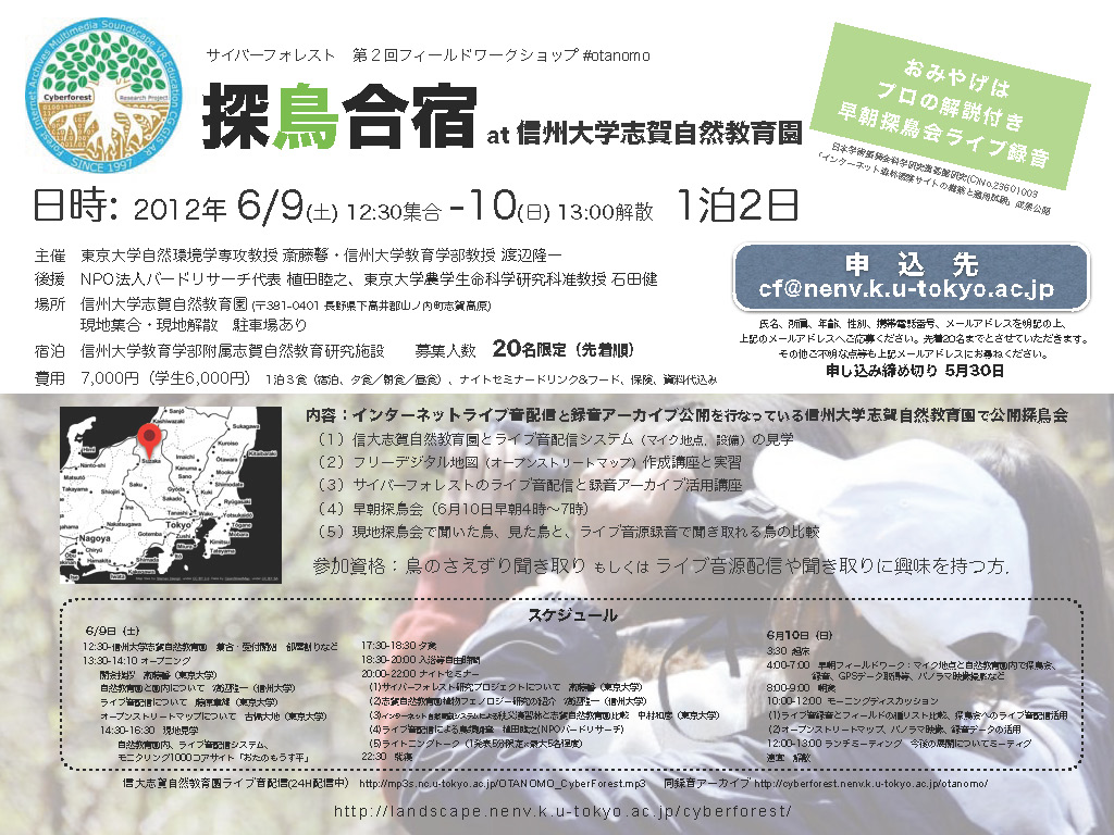 鳥のさえずりや聞き取り,ライブ音配信,自然地のオープンストリートマップ、サイバーフォレスト等に興味ある方ならどなたでも参加できます。詳細は以下の通りです。(画像をクリックしてパンフレットをダウンロードしてください。)